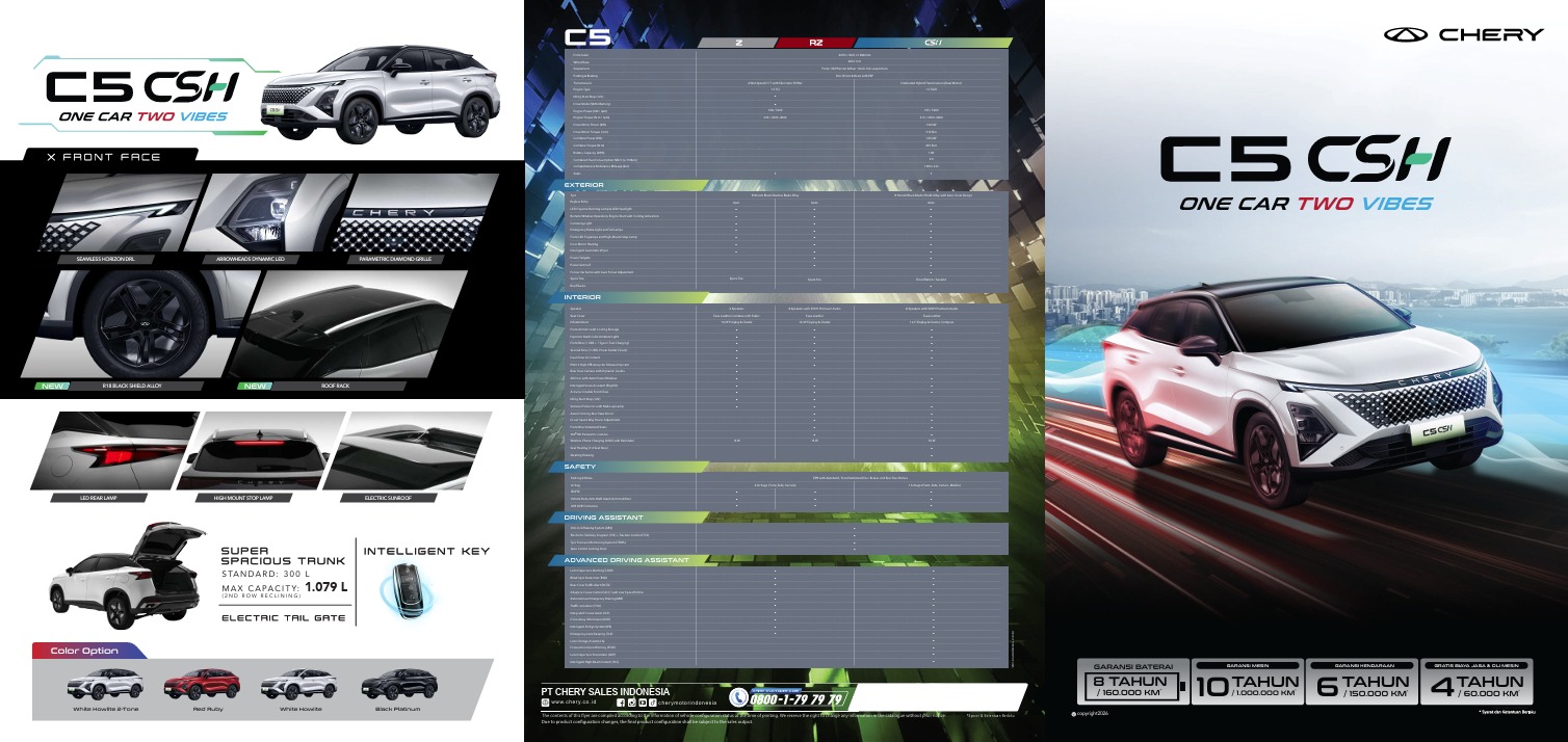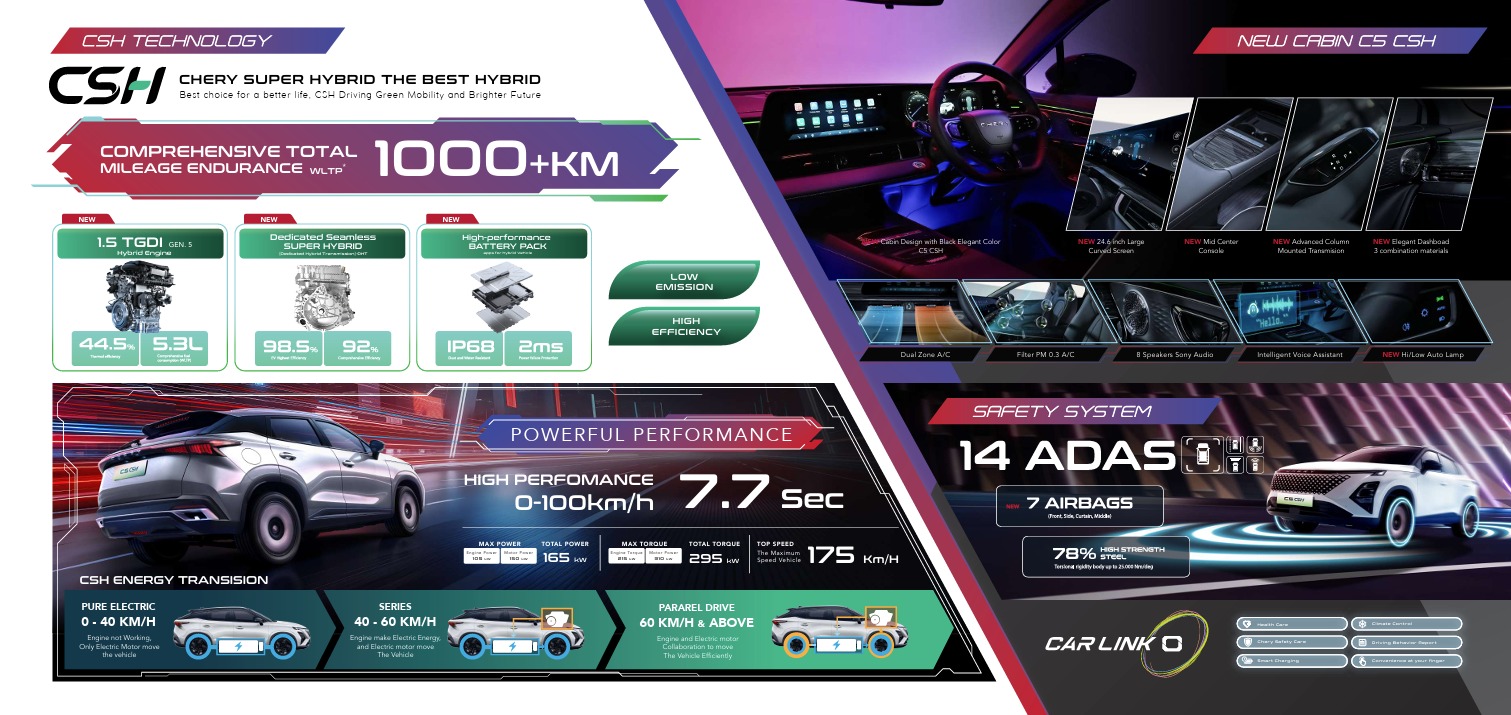 Rasakan Teknologi Hibrida Cerdas Chery. Tempuh jarak lebih jauh dengan konsumsi bahan bakar minimal, berkat perpaduan harmonis antara teknologi DHE, DHT, dan baterai hibrida yang inovatif.Rasakan sensasi berkendara yang sesungguhnya. Nikmati lonjakan adrenalin dari 0-100 km/jam hanya dalam 7,7 detik dengan kecepatan puncak 175 km/jam. Performa murni yang dirancang untuk memacu semangat di setiap perjalanan Anda.